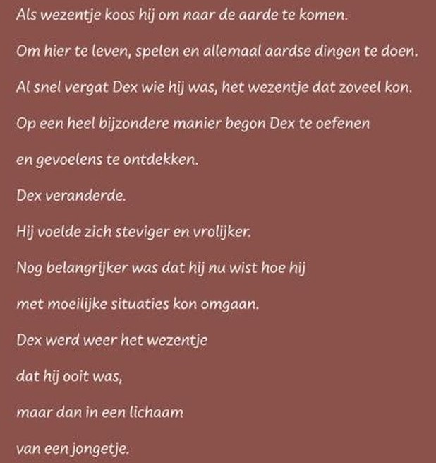 Dex ontdekt is een verhaal voor alle kinderen, dat ook volwassenen ontroert. Verankerd zijn in je binnenzijn, waarin je door alle vervelende en fijne gevoelens jezelf kan ervaren. Dex ontdekt dat zijn gevoelens hem de weg wijzen naar zijn gouden hart. Hij wordt zijn eigen allerbeste vriend te zijn! Zo voelt hij zich krachtig en in balans om zijn leven te leven.